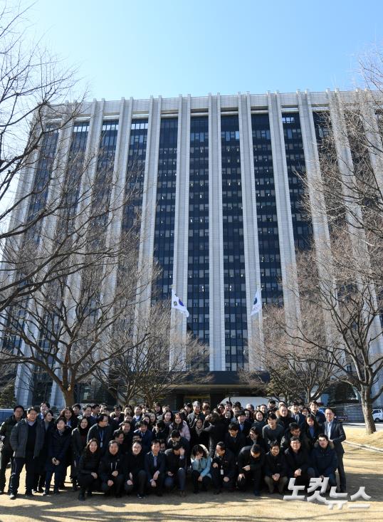 7일 오후 서울 종로구 정부서울청사에서 행정안전부 관계자들 기념촬영을 하고 있다. 행정안전부가 1948년 내무부·총무처 출범 이후 70여년 간 이어온 광화문 시대를 마감하고 세종시로 이전 하게 됐다.