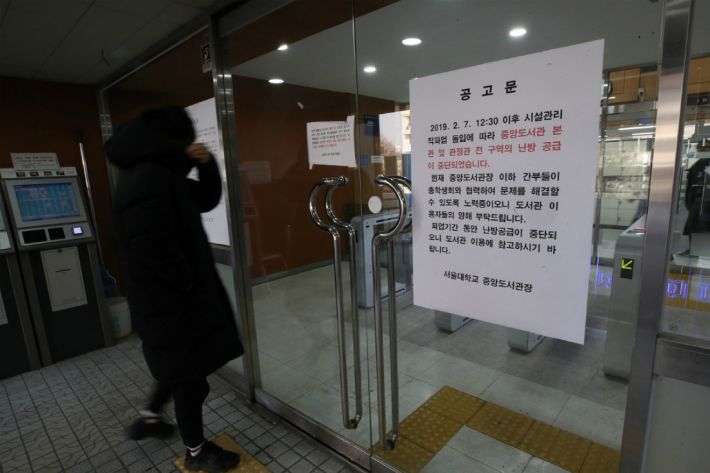 8일 오후 서울 관악구 서울대학교 중앙도서관에 시설관리직 파업에 따른 난방공급 중단을 알리는 안내문이 붙어있다. 중앙난방 시스템이 아닌 개별난방으로 운영되는 난방 장치는 계속 가동되고 있다.(사진=연합뉴스)