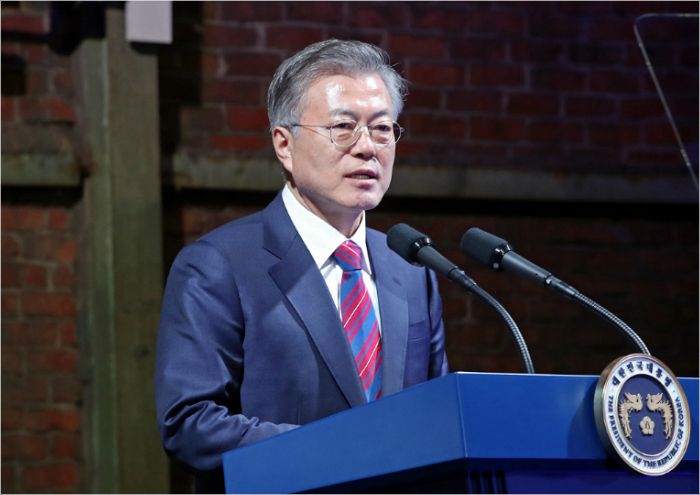 문재인 대통령이 13일 오후 부산광역시 사상구 사상공단 내 대경 PNC에서 열린 대한민국 도시 미래, 부산 대개조 비전 선포식에서 연설하고 있다. 문 대통령의 이날 행사는 문 대통령의 전국 경제투어 여섯 번째 행사로 열렸다.(사진=연합뉴스)