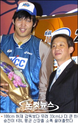 이처럼 선수들의 평균 신장과 체중이 늘어난 가장 큰 이유는 올 시즌 첫 선을 보이는 프로농구 역대 최장신 신인 하승진(KCC)의 합류에서 찾아볼 수 있다. 하승진의 신장과 체중은 221.6cm, 140kg. 프로농구 역대 최고 기록으로 지난 시즌까지 최장신, 최중량 기록 보유자인 서장훈(207cm,117kg·KCC)의 기록을 가뿐히 갈아치웠다.