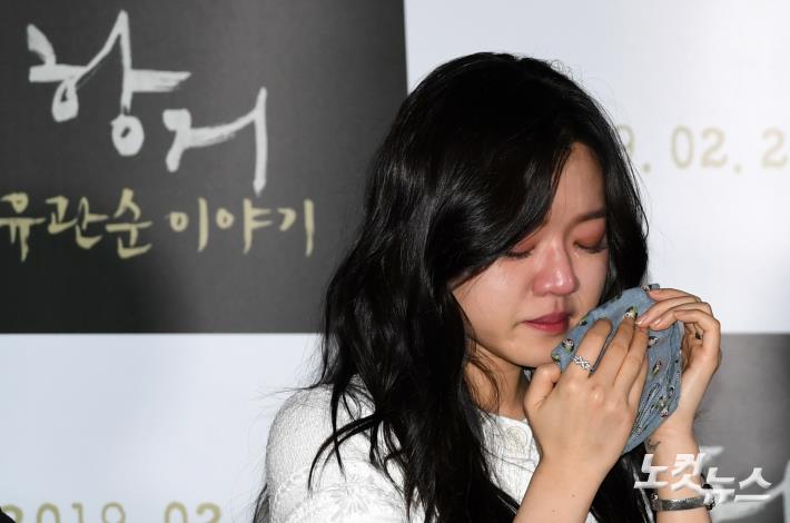 배우 고아성이 15일 오후 서울 광진구 롯데시네마 건대입구점에서 열린 영화 '항거: 유관순 이야기' 언론시사회에서 영화 관람 후 눈물을 흘리고 있다.