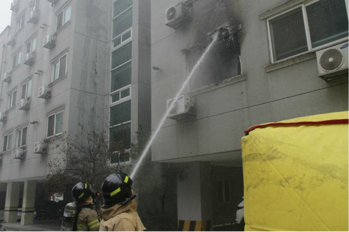 19일 낮 12시 19분쯤 충남 천안시 두정동 한 오피스텔에서 불이 나 5명이 부상을 입고 치료를 받고 있다. 사진은 출동한 소방관들이 화재를 진화하는 모습. (사진=충남 서북소방서 제공)