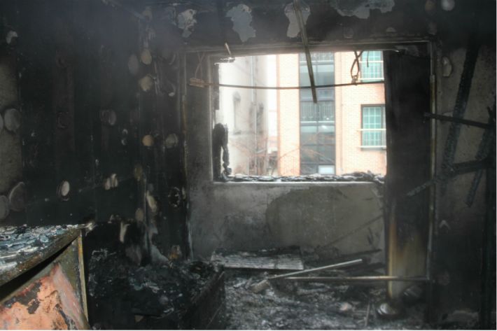 19일 낮 12시 19분 쯤 충남 천안시 두정동 한 오피스텔에서 화재가 발생해 5명이 부상을 입었다. 사진은 화재가 발생해 방안이 검게 그을린 모습. (사진=천안 서북소방서 제공)
