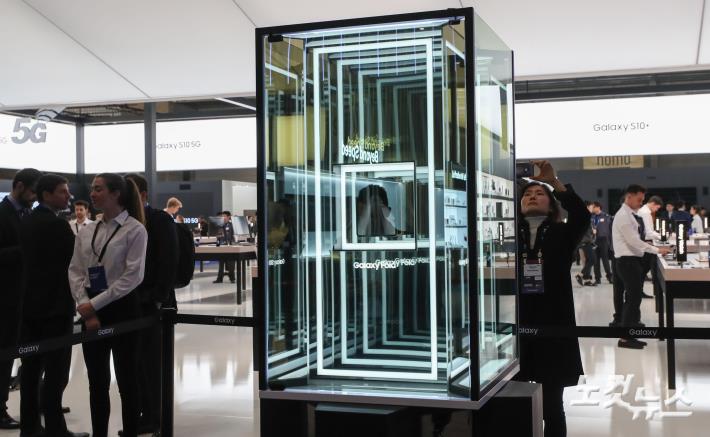 세계 최대 모바일 박람회 'MWC19' 개막일인 25일(현지시간) 스페인 바르셀로나 피아그란비아 전시관 삼성전자 부스에 '갤럭시 폴드(Galaxy Fold)'가 전시되어 있다.