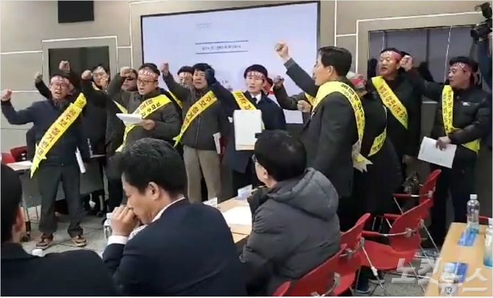 26일 금강 공주보 처리를 위한 민·관협의체 회의에서 농민단체 등 민간위원들이 "공주보 해체를 결사 반대한다"는 구호를 외치고 있다. (사진=고형석 기자)