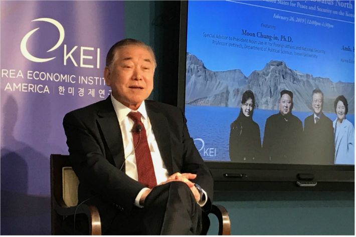 문정인 청와대 외교안보 특별보좌관이 26일(현지시간) 미국 워싱턴DC 한미경제연구소(KEI)에서 대담을 하고 있다. (사진=장규석 워싱턴 특파원)