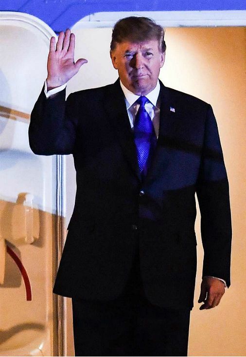 도널드 트럼프 미국 대통령이 2차 북미정상회담 개최를 하루 앞둔 26일(현지시간) 베트남 하노이 노이바이 국제공항에 도착해 환영인사들에게 손을 흔들고 있다. (사진=연합뉴스)