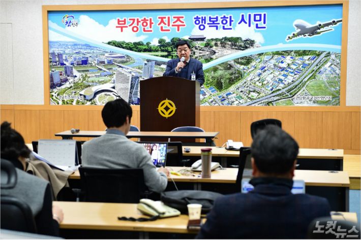 진주시 이정희 경제통상국장이 28일 차세대 중형위성 유치실패에 따른 유감 표명을 하고 있다. (사진=진주시 제공)