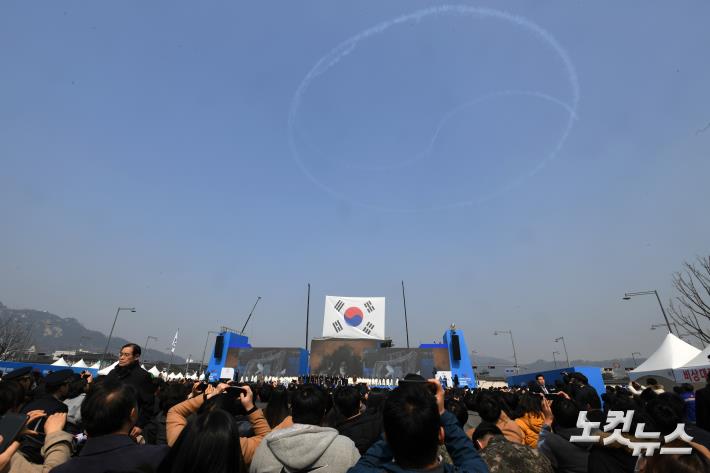 1일 서울 광화문광장에서 열린 제100주년 3.1절기념식 상공에 공군의 특수비행팀 블랙이글스가 태극기를 새기고 있다.