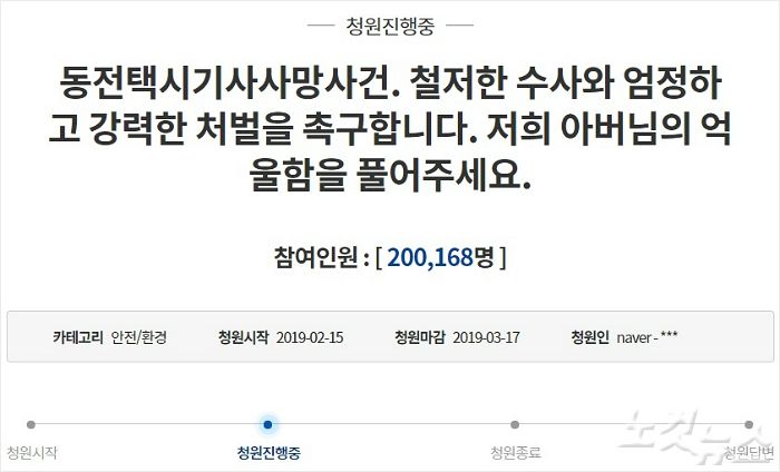청와대 청원 게시판을 보면 지난달 15일 올라온 "동전택시기사사망사건. 철저한 수사와 엄정하고 강력한 처벌을 촉구합니다. 저희 아버님의 억울함을 풀어주세요"라는 제목의 청원에 3일 오후 20만명이 넘는 국민이 동의했다.