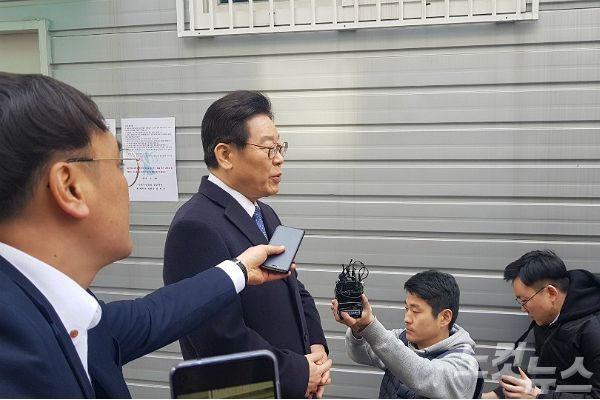 이재명 경기지사가 지난달 28일 열린 직권남용 혐의 등에 대한 6차 공판에 출석, 기자들에게 관련 입장을 밝히고 있다.(사진=동규기자)