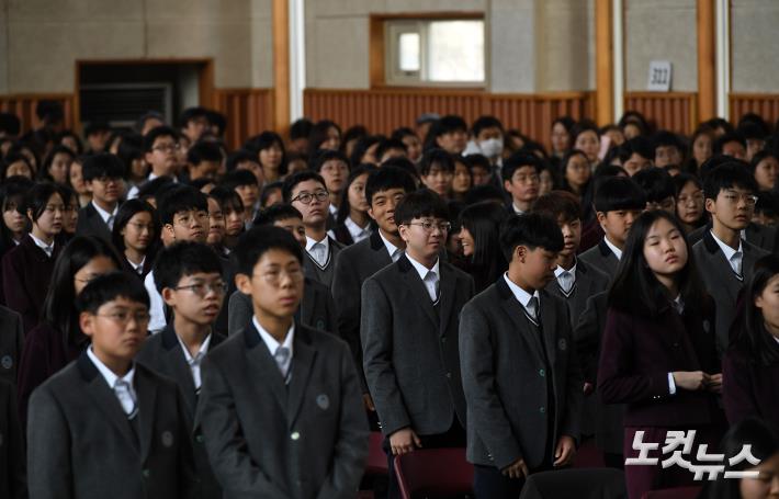 4일 오후 서울 강남구 대치동 대청중학교에서 신입생들이 입학식에 참석하고 있다.
