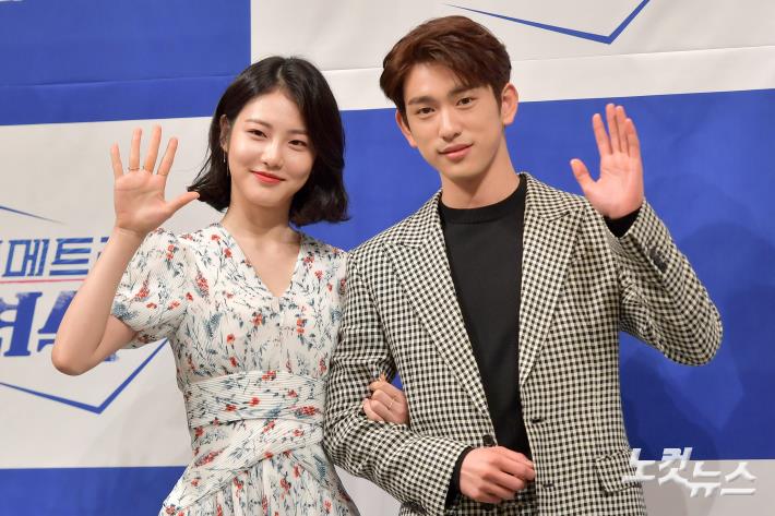 배우 신예은(왼쪽)과 GOT7 박진영이 5일 서울 논현동 임피리얼팰리스호텔에서 열린 tvN 월화드라마 '사이코메트리 그녀석' 제작발표회에서 포즈를 취하고 있다.