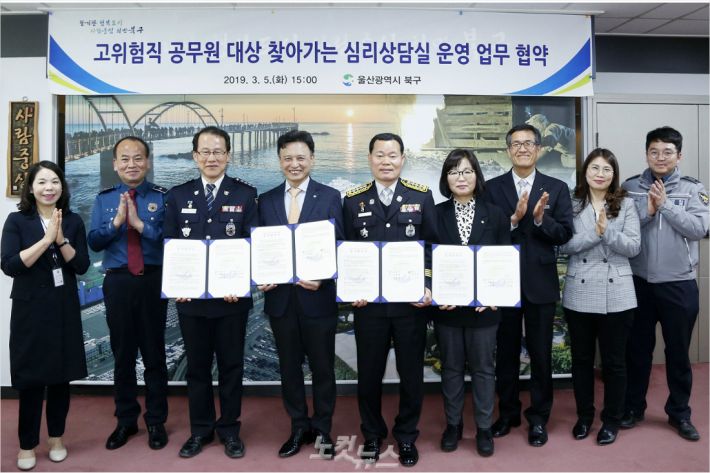 울산 북구청과 북부소방서, 중부경찰서는 5일 북구청장실에서 고위험직 공무원을 위한 찾아가는 심리상담실 업무협약을 체결했다.