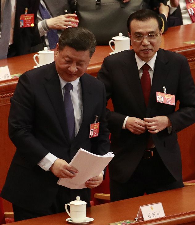 5일 중국 베이징 인민대회당의 전국인민대표대회(전인대) 개막식이 끝난 뒤 시진핑 주석(왼쪽)과 리커창(李克强) 총리가 자리에서 함께 일어나고 있다.그는 이날 미중 무역 전쟁의 충격파 속에서 급속한 경기 둔화 위기에 대처하기 위해 700조원에 가까운 규모의 경기 부양 패키지를 내놓았다. (베이징 EPA=연합뉴스)