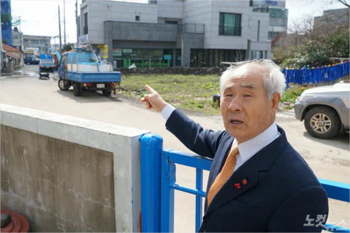 김두연(75) 전 4.3희생자유족회장이 큰 형이 총살됐을 것으로 추정되는 곳을 가리키고 있다. 4.3 당시엔 개천이 흐르고 있었지만, 현재엔 식당가가 자리잡고 있다. (사진=고상현 기자)