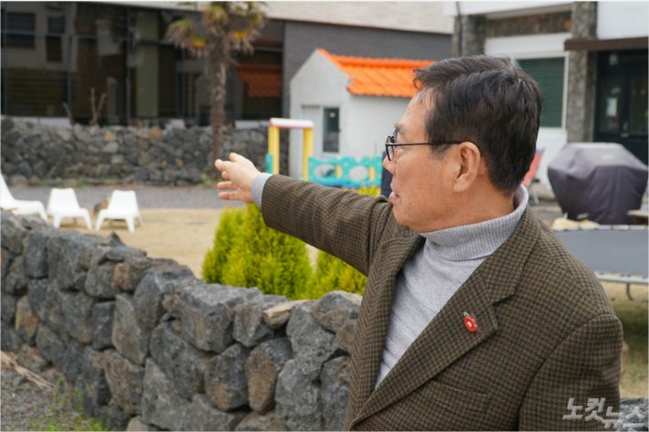 한문용(70)씨가 4.3의인인 할아버지가 총살됐을 것으로 추정되는 곳을 가리키고 있다. 지금은 주택가가 들어서 있다. (사진=고상현 기자)