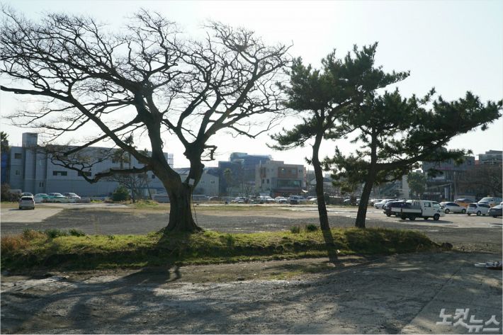 옛 함덕국민학교 터. 현재는 해수욕장을 찾는 관광객들의 주차 공간으로 변해 있다. 4.3 당시 학교 운동장에 심어져 있었던 고목 몇 그루만이 남아 있다. (사진=고상현 기자)