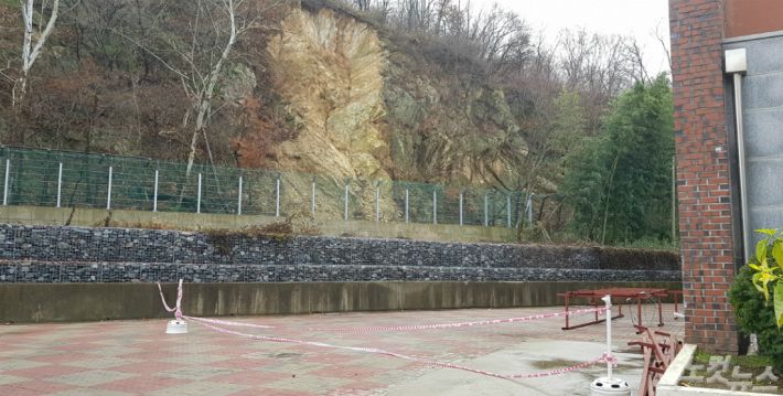 붕괴 위험이 있는 절개지가 방치되고 있는 서천 A초등학교. (사진=김화영 기자)