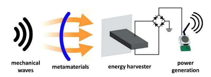 메타 에너지 하베스팅 시스템의 모식도. 기계적 에너지원에서 발생하는 파장을 메타물질로 모은 다음 압전소자 기반의 에너지 하베스팅을 통해 전기를 생산한다. (사진=한국표준과학연구원 제공)