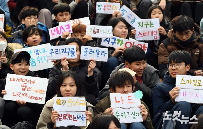 15일 오후 서울 종로구 세종문화회관 중앙계단에서 청소년기후소송지원단 주최로 열린 ‘315 청소년 기후행동’ 집회에 참가한 청소년들이 빈상자를 재활용한 피켓을 들어보이고 있다.