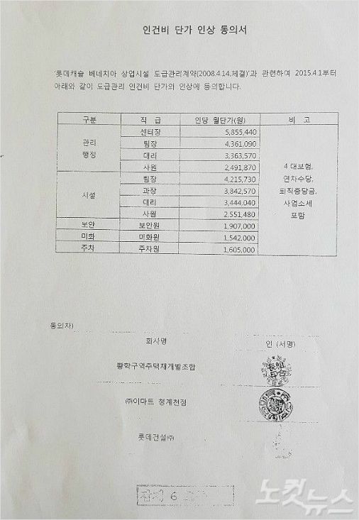 이마트 청계천점 인건비 인상동의서 (사진=롯데캐슬 베네치아 상가 소유자협의회 제공)
