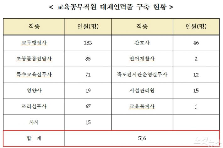 교육공무직원들의 실질적인 휴가와 휴직 등을 보장하고, 일선 학교의 대체 인력 채용 부담을 줄이기 위한 것으로 세종교육청은 교무행정 183명과 급식지원 67명, 돌봄지원 85명 등 모두 11개 직종 516명의 대체인력을 확보했다.