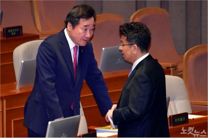 이낙연 국무총리가 19일 국회 본회의에서 더불어민주당 이철희 원내수석부대표와 이야기를 하고 있다.
