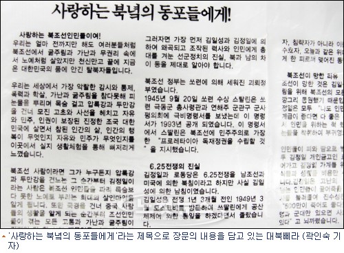 A4 용지보다 조금 작은 크기의 비닐 재질 앞뒷면에 깨알같은 글씨로 "북조선 정부는 소련에 의해 세워진 괴뢰정부다. 6.25 전쟁은 김일성에 의한 남침이었다"고 적고 있다.