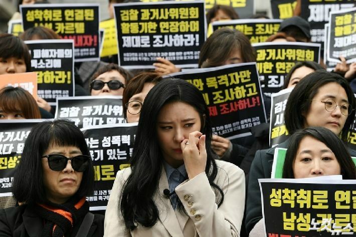 지난 15일 오전 서울 세종문화회관 계단 앞에서 열린 검찰 과거사위 '김학의 전 법무부 차관 등에 의한 성폭력 사건 및 고 장자연 씨 사건 진상 규명 촉구 기자회견에서 배우 윤지오씨가 발언을 마치고 울먹이고 있다. (사진=이한형 기자)