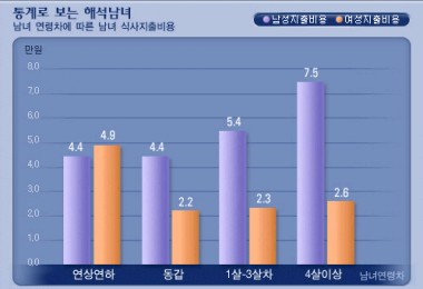 [BestNocut_L]이 외에 다른 집단의 여성들은 모두 3만원 이하의 식사비용을 지출하는데, 그 중 동갑집단은 남녀의 지출차이가 가장 적었으며 연령차가 4살 이상 차이나는 집단이 가장 지출차이가 컸다.