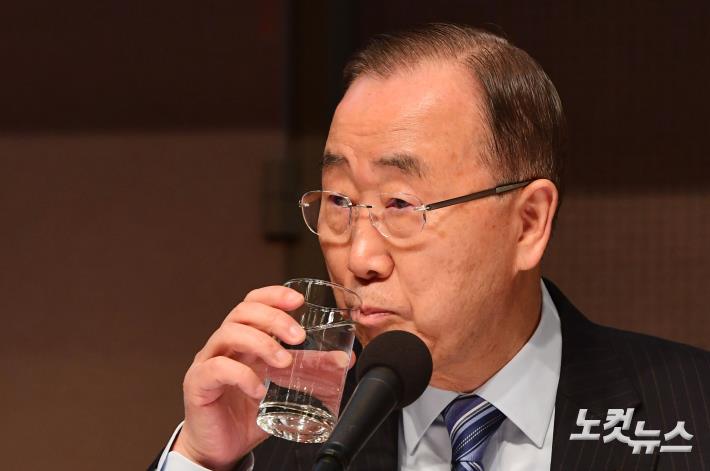 반기문 전 유엔 사무총장이 26일 오후 서울 중구 한국프레스센터에서 열린 관훈토론회에 참석해 시작 전 물을 마시고 있다.