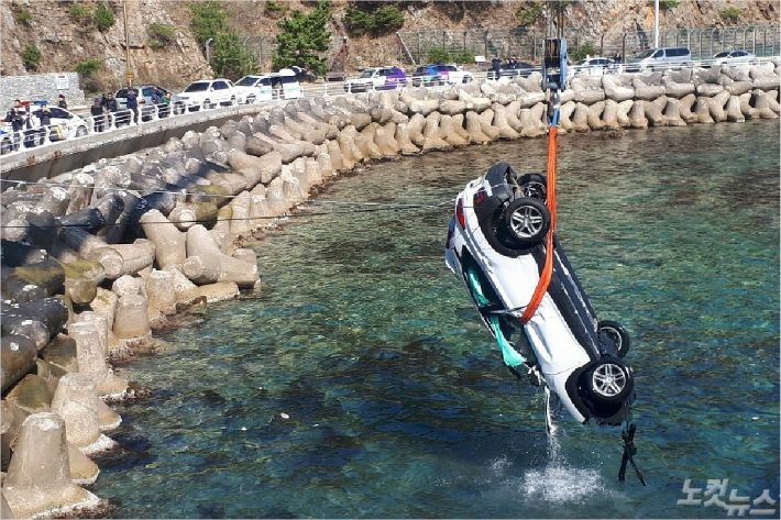 바다에 빠진 차량이 도로 위로 인양돼 있다. (사진=유선희 기자)