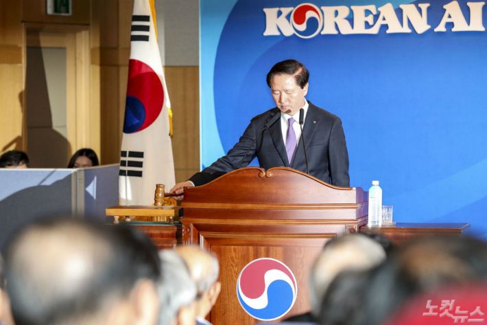 우기홍 대한항공 대표이사가 27일 서울 강서구 대한항공 본사에서 열린 '대한항공 정기 주주총회'에 참석해 의사봉을 두드리고 있다. (사진=이한형 기자)