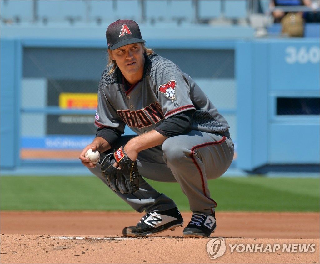 '안 풀리네' 애리조나 잭 그레인키는 29일(한국 시각) 예전 몸담았던 다저스와 원정 개막전에 선발 등판했지만 4이닝도 채우지 못한 채 7실점하며 패전을 안았다.(LA=연합뉴스)
