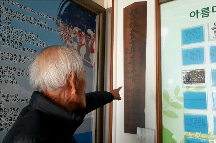 대포초 졸업생 최창영(83)씨가 상량판을 가리키고 있는데, 상량판에는 "1921년 11월 11일 상량(上樑)을 축하한다"는 글귀가 적혀 있다. (사진=유선희 기자)