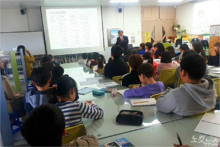 지난달 29일 대포초등학교에서 '대포의 역사와 만세운동'에 대한 강의가 진행됐다. (사진=유선희 기자)