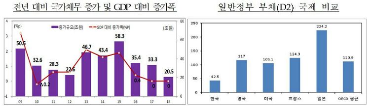 국가채무가 지난해말 기준 651조 8천억원으로 일년새 24조 4천억원가량 늘어난 것으로 나타났다. GDP(국내총생산) 대비 36.6% 수준으로, 2013년 이후 가장 낮은 폭의 증가치다.