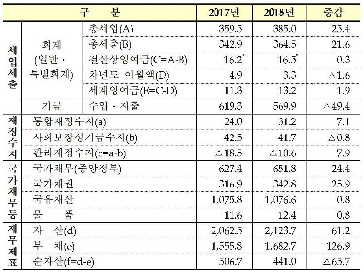 통합재정수지는 31조 2천억원 흑자로 2017년의 24조원 흑자에 비해 폭을 한층 키웠다. 여기에서 사회보장성기금을 뺀 관리재정수지는 10조 6천억원 적자로 2017년의 18조 5천억원 적자에 비해 폭을 크게 줄이며 3년 연속 개선됐다.