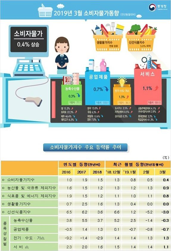 통계청이 2일 발표한 '3월 소비자물가동향'에 따르면 지난달 소비자물가지수는 작년 같은 달보다 0.4% 올라 2016년 7월(0.4%) 이후 2년 8개월 만에 가장 낮은 상승폭을 기록했다.
