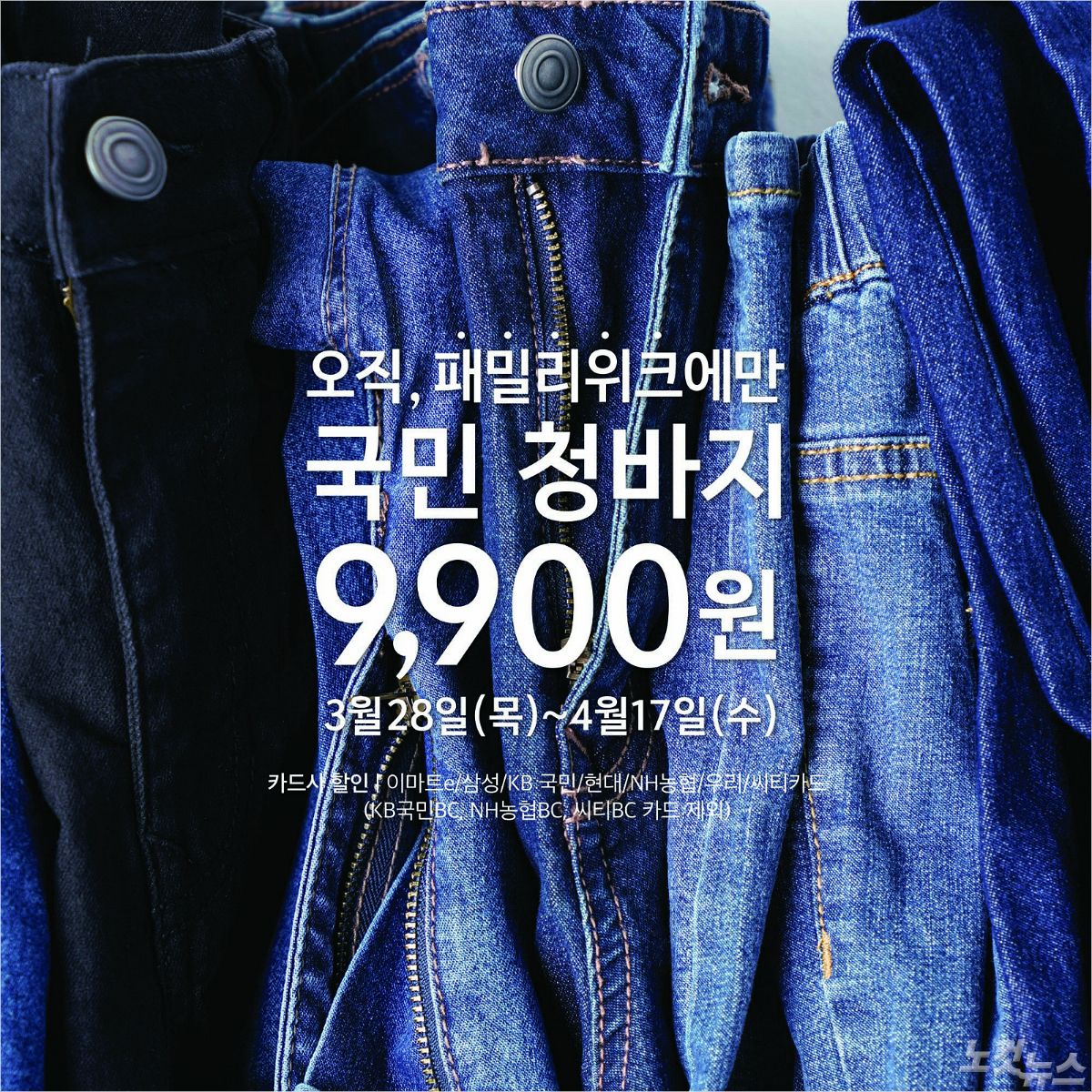 이마트는 1년에 단 한 번 선보이는 연중 최대 규모의 의류 할인 행사인 '데이즈 패밀리위크'를 통해 성인 남녀와 유아용 청바지, 티셔츠를 9900원에 판매한다.