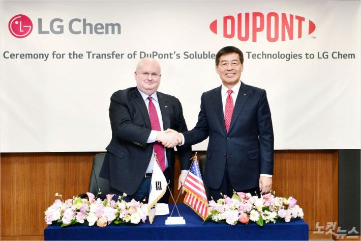 LG화학은 2일, 서울 여의도 LG트윈타워에서 신학철 부회장과 듀폰 마크 도일 부회장 등이 참석한 가운데 '솔루블 OLED 재료기술 인수식'을 개최했다고 밝혔다.