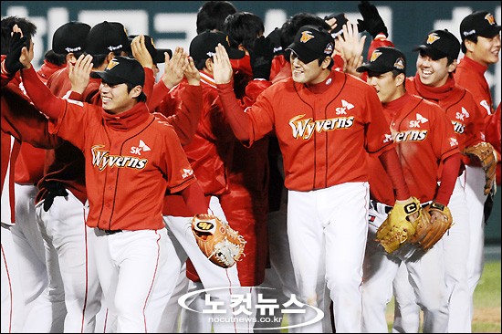 [BestNocut_R]29일 오후 서울 잠실야구장에서 열린 프로야구 한국시리즈 3차전 SK-두산의 경기에서 9회말 1사 만루 위기를 넘기고 3-2 승리를 거머쥔 SK 선수들이 그라운드에 모여 하이파이브를 나누고 있다.