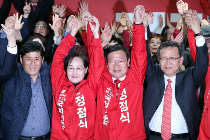 정 의원은 당선 직후 소감을 통해 “지역 경제를 살려달라는 염원을 반드시 이뤄내겠다”고 밝혔다. 정 의원은 황 대표의 측근이다. 황 대표로선 고성 출신을 공천했다는 위험부담을 감수했지만, 낙승하면서 한 시름 놓게 됐다.