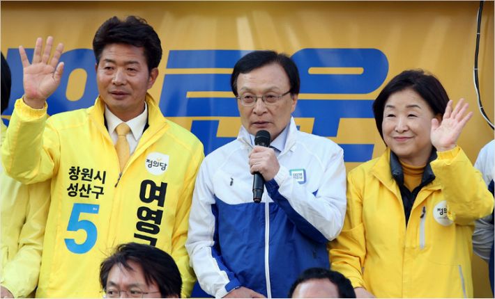 더불어민주당 이해찬 대표(가운데)가 2일 오후 경남 창원 성산구 성원주상가 삼거리에서 4·3 국회의원 보궐선거 정의당 창원성산 여영국 후보 지지를 호소하고 있다. (사진=연합뉴스)