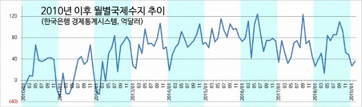 한국은행이 4일 공개한 '2019년 2월 국제수지(잠정)'에 따르면 2월 경상수지가 36억달러 흑자를 기록해 2012년 5월 이후 매달 흑자가 계속되고 있다.