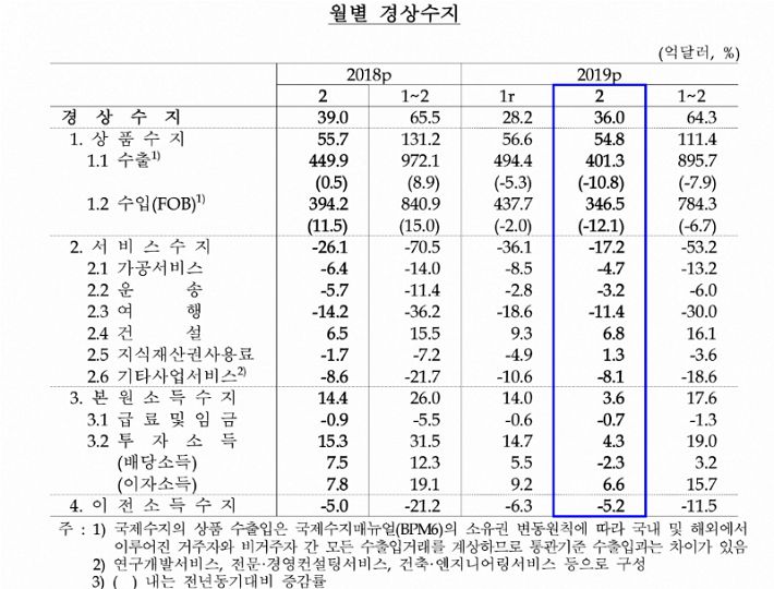 상품수지 흑자규모는 전년동월 55억7000만달러에서 54억8000만달러로 축소됐다. 특히 수출이 반도체 단가 하락, 석유류 수출 부진, 중국 제조업 경기 둔화 등 탓에 전년동월 대비 48억6000만달러 줄어든 401억3000만달러에 그쳤다.