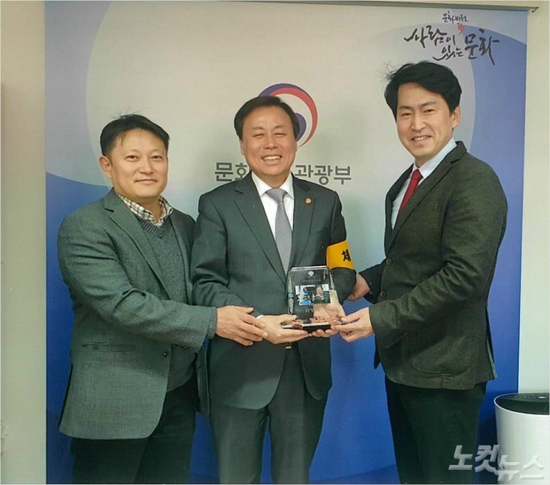 한국체육기자연맹이 도종환 문화체육관광부 장관에게 명예체육기자패를 전달하고 있다. 사진 왼쪽부터 이성훈 연맹 부회장, 도종환 장관, 정희돈 연맹 회장 (사진=한국체육기자연맹 제공)
