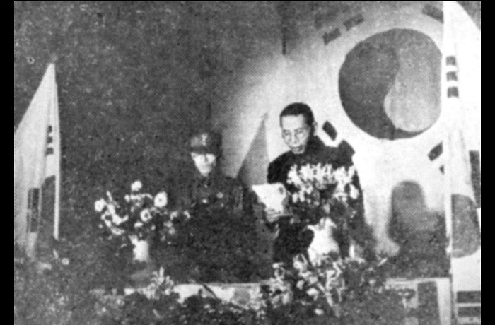 한국광복군 성립 전례식에서 대회사를 하는 김구. 한국 광복군 성립 전례식이 1940년 9월 17일 중경 가릉빈 관에서 거행되었다. 임시 정부 국무 위원과 중국인, 기타 외국인 등 200여 명이 참석했다.