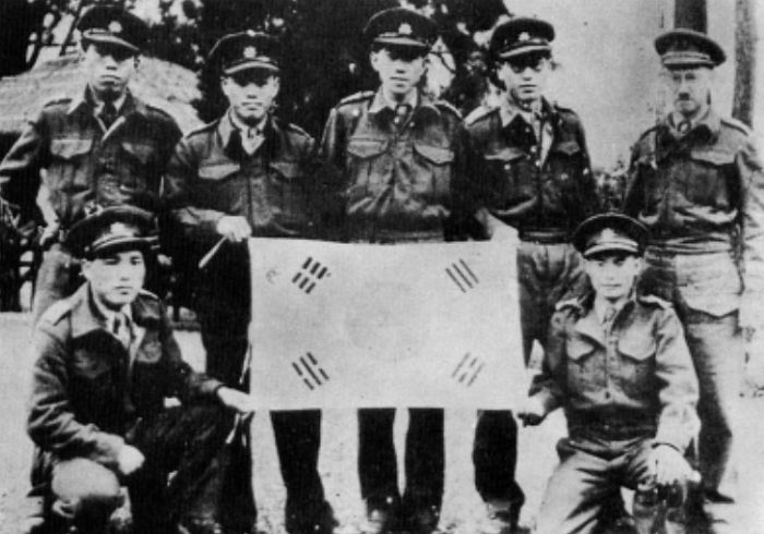 한국 광복군 총사령부 성립 전례식에 참석한 한중 대표한국 광복군은 대한민국 임시 정부의 군대였다. 중국 충칭의 가릉빈관(嘉陵賓館)에서 한국 광복군 성립 전례식이 열렸다. 총사령관은 지청천, 참모장은 이범석이었다. 앞줄 왼쪽 여섯 번째부터 홍진, 이청천, 김구, 차이석이고, 한 사람 건너서 이시영이다